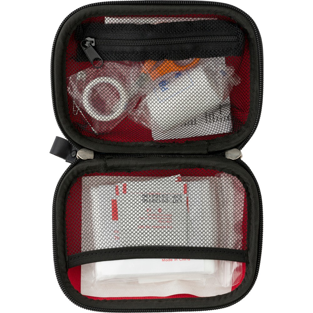 Apteczka w pokrowcu, zawiera: 1 sterylną chusteczkę z non woven, 1 bandaż w rolce, 1 trójkątny bandaż, 2 agrafki, nożyczki, 4 chusteczki nasączone alkoholem, 5 plastrów i 1 rolkę taśmy