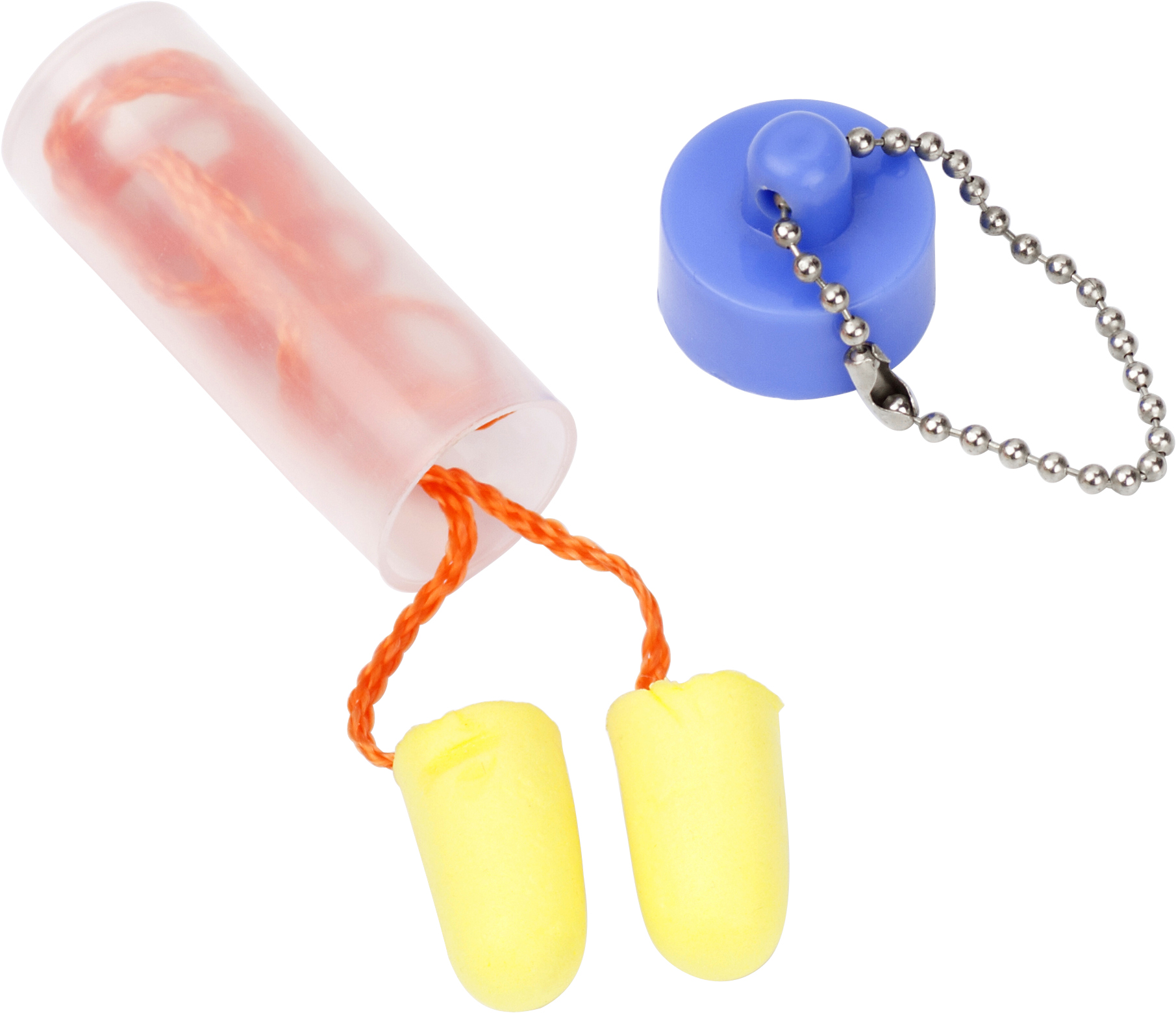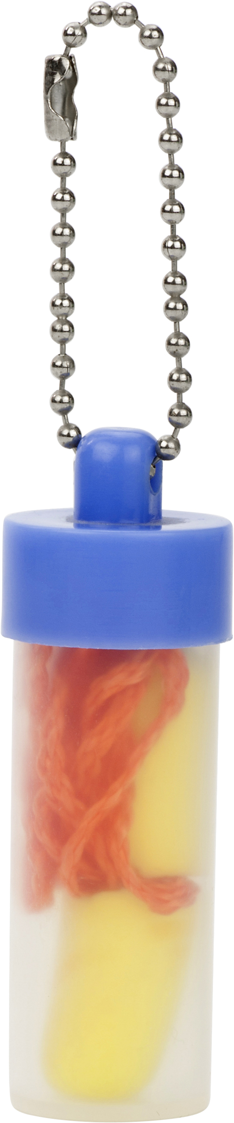 Zatyczki do uszu, sznurek ok. 65 cm, w przezroczystym pudełku z kolorowym wieczkiem i łańcuszkiem