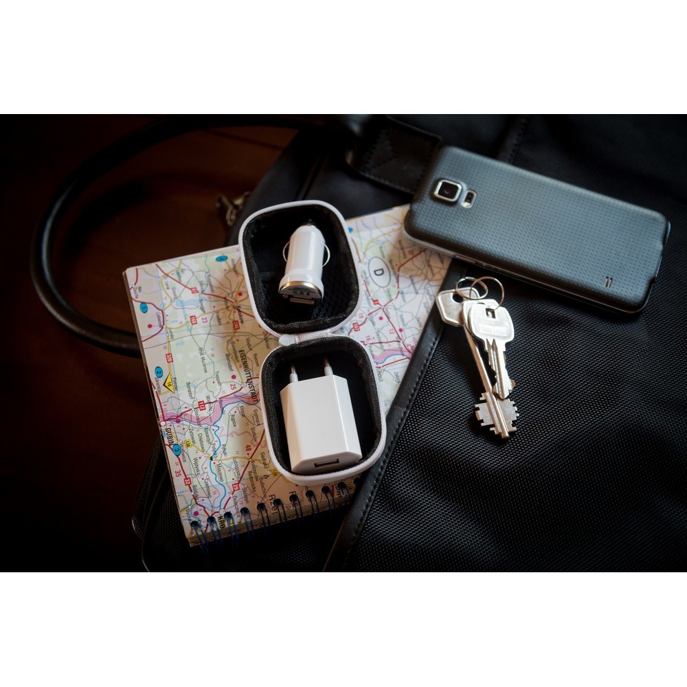 Podręczny zestaw w etui, adapter sieciowy (wejście 100-240V, 50/60HZ ±0.3A, wyjście 5V/1A) i ładowarka samochodowa (wejście 12-24V, wyjście 5V/1A)