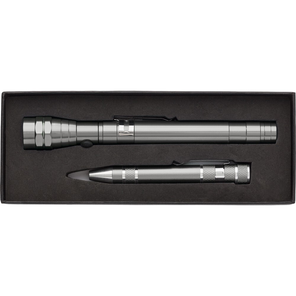 Zestaw narzędzi w pudełku: teleskopowa latarka 3 LED oraz śrubokręt w kształcie długopisu z 4 płaskimi i 4 krzyżakowymi końcówkami