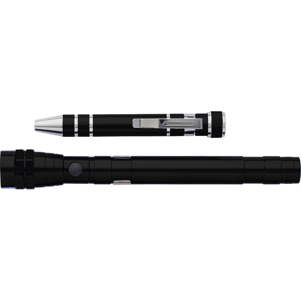 Zestaw narzędzi w pudełku: teleskopowa latarka 3 LED oraz śrubokręt w kształcie długopisu z 4 płaskimi i 4 krzyżakowymi końcówkami