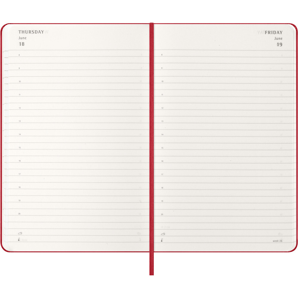 Kalendarz moleskine został wykonany z najwyższej jakości materiałów. Twarda okładka pokryta jest eleganckim, ciemnoniebieskim materiałem, który jest przyjemny w dotyku i odporny na zabrudzenia. Dzięki temu kalendarz nie tylko wygląda profesjonalnie, ale również jest trwały i wytrzymały. Minimalistyczny design z delikatnym logo Moleskine nadaje kalendarzowi nowoczesnego charakteru.