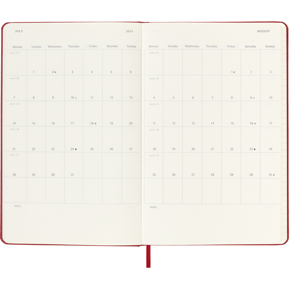 Kalendarz moleskine został wykonany z najwyższej jakości materiałów. Twarda okładka pokryta jest eleganckim, ciemnoniebieskim materiałem, który jest przyjemny w dotyku i odporny na zabrudzenia. Dzięki temu kalendarz nie tylko wygląda profesjonalnie, ale również jest trwały i wytrzymały. Minimalistyczny design z delikatnym logo Moleskine nadaje kalendarzowi nowoczesnego charakteru.