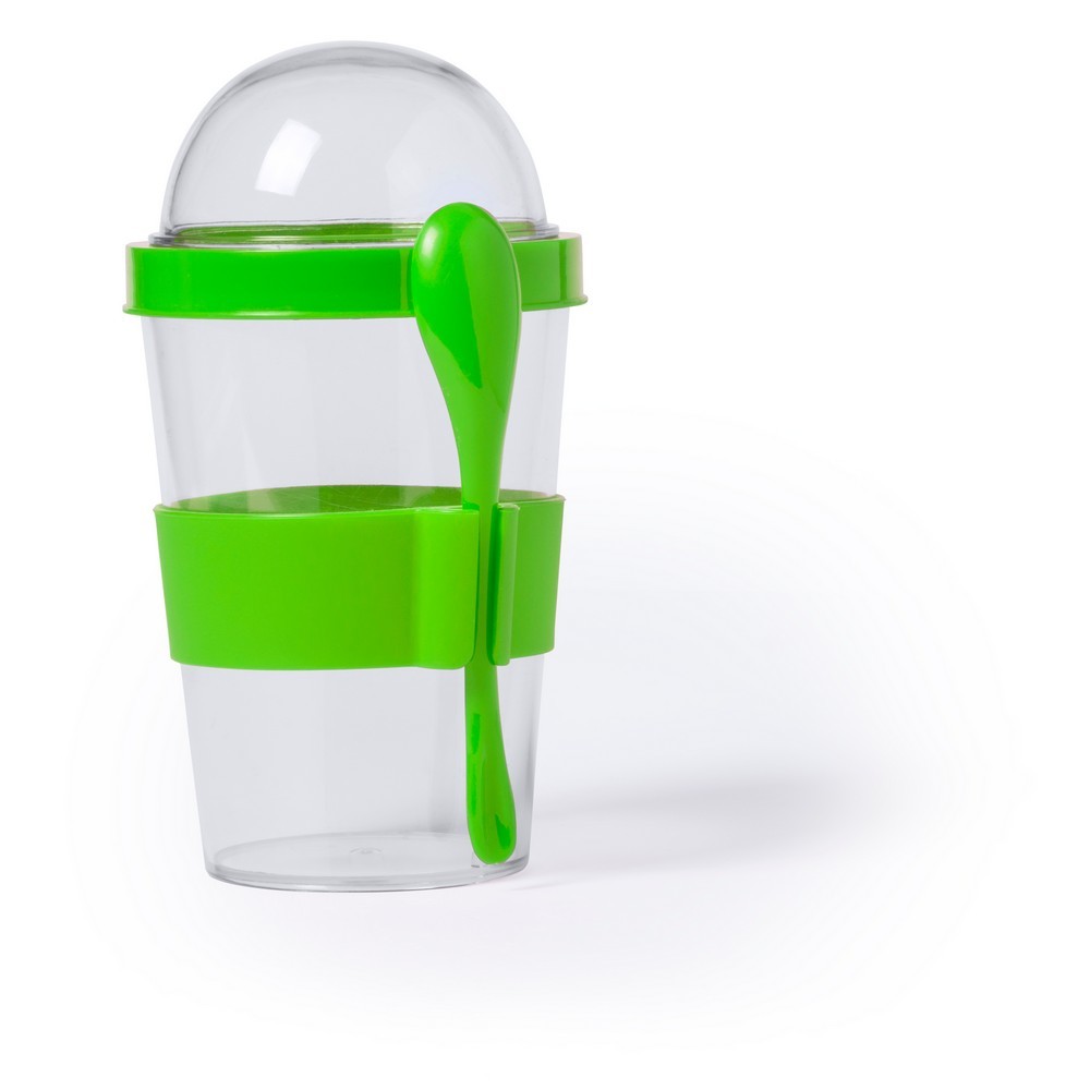 Pudełko śniadaniowe (420 ml) z oddzielnym pojemnikiem na górze i kolorową obręczą, która przytrzymuje łyżeczkę