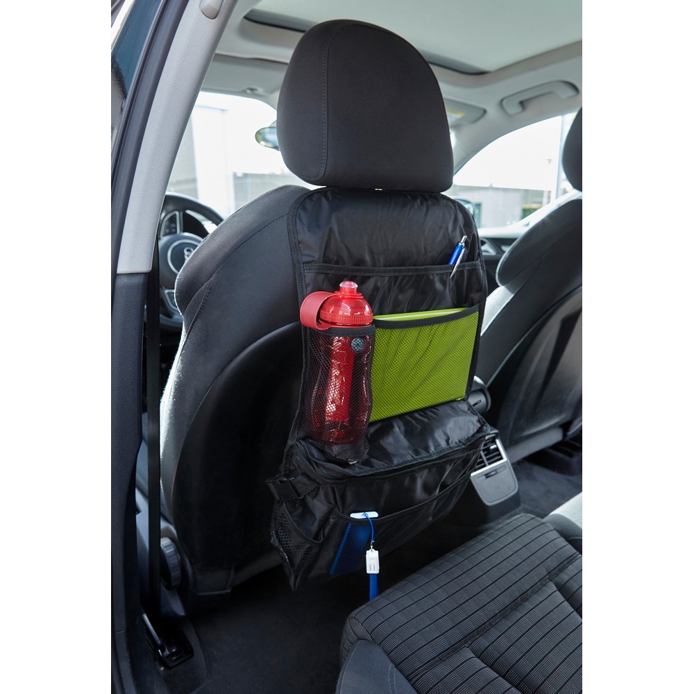 Składany organizer samochodowy, duża siateczkowa kieszeń, miejsce na butelkę i przegroda termiczna na zamek, mocowanie do fotelu samochodowego