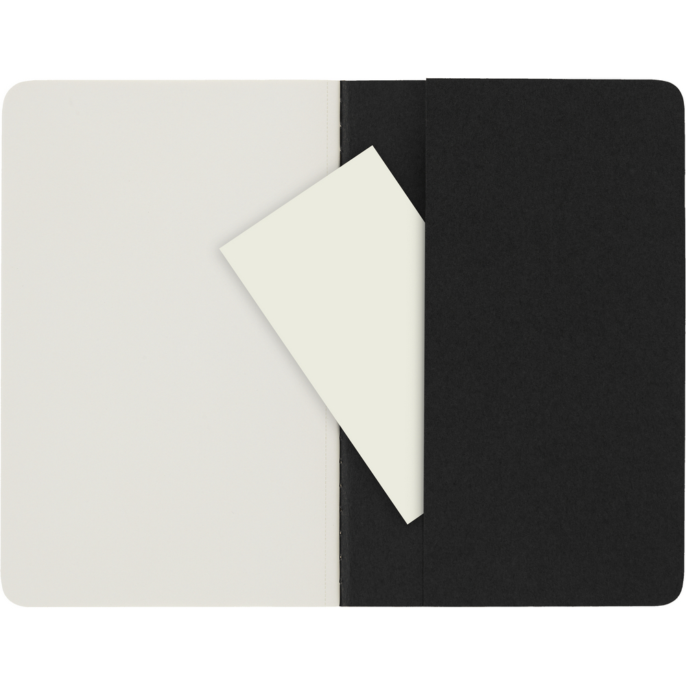 Kieszonkowy (pocket) zeszyt MOLESKINE Cahier Journal (64 gładkie strony), miękka okładka z widocznymi przeszyciami na grzbiecie, kieszeń wewnętrzna, 16 kartek z perforacją umożliwiającą wyrwanie na końcu