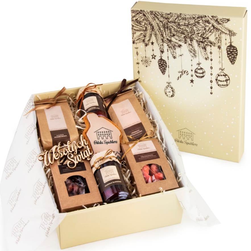 Zestaw w ozdobnym, świątecznym pudełku zawiera aromatyczną kawę i herbatę, świąteczny piernik, truskawki oraz migdały w czekoladzie, a także żurawinę idealną do mięs i powidła śliwkowe. To bez wątpienia oryginalny i wyszukany pomysł na upominek.