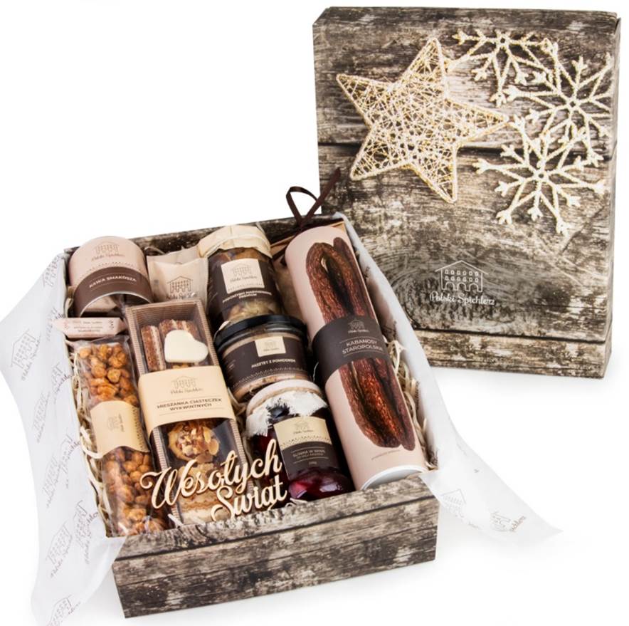 Zestaw różnych smaków to doskonała propozycja na prezent dla zwolenników zdecydowanych smaków, aniżeli słodyczy. Znajdują się w nim kabanosy w tubie, śliwka w winie do mięs i deserów, podgrzybki marynowane, pasztet z pomidorem, kawa mielona w puszce, mieszanka wykwintnych ciasteczek, a także krówki, migdały w białej czekoladzie z cynamonem oraz orzeszki ziemne w karmelu.