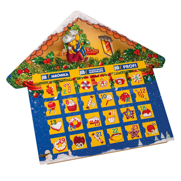 Słodkie odliczanie dni do świąt może być jeszcze przyjemniejsze, właśnie dzięki temu kalendarzowi. Produkt może zawierać szatę graficzną według własnego projektu, a także może być w dowolnym kształcie. Umożliwia to dopasowanie go do branży firmy lub zainteresowań obdarowywanej osoby.